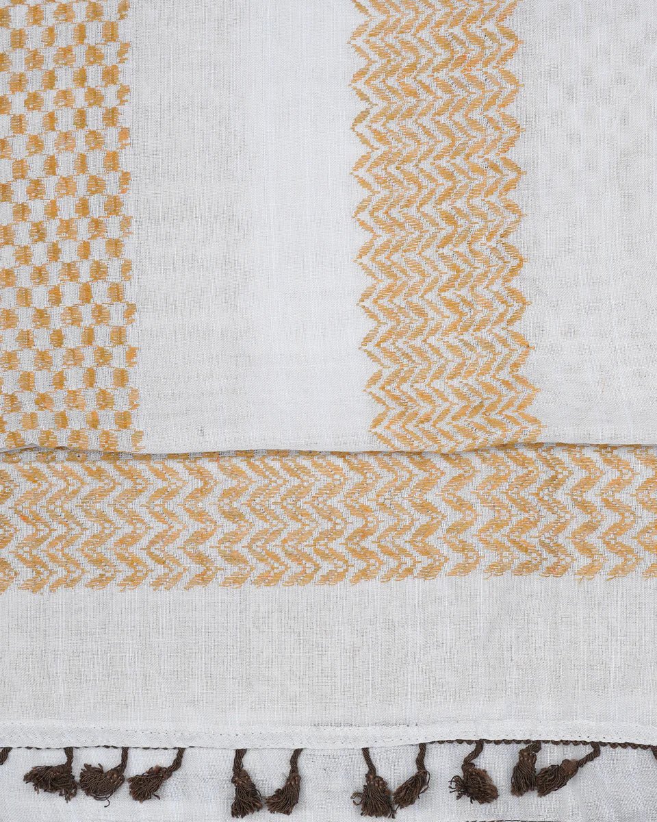 Each keffiyeh is handcrafted using a traditional cross-stitch weaving method passed down through generations. It’s made of two carefully layered weaves, the base and the intricate pattern (known as “warda” or “flower” in Arabic).