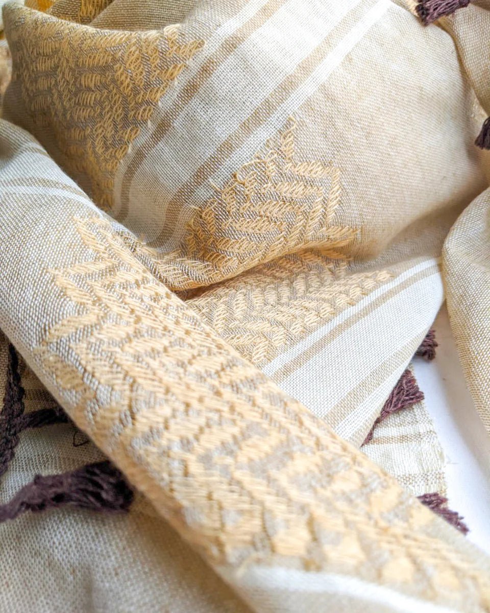 The Alquds Kufiya is our tribute to the spirit of Jerusalem, or Al Quds (القدس). As the heart of hearts and the most prominent symbol of the Palestinian diaspora, Jerusalem embodies the timeless beauty and unwavering strength of the Palestinian people. Our authentic Palestinian Keffiyeh, with a light gold pattern on a raw cotton base, captures the essence of this sacred city. With its brown laces, the Alquds shemagh reflects the enduring heritage, rich history, and steadfast determination of Jerusalem and the Jerusalemites. Embrace the tradition and heritage of Palestine with this authentic and traditional Kufiya, a symbol of resilience, solidarity, and the indomitable spirit of Al Quds.