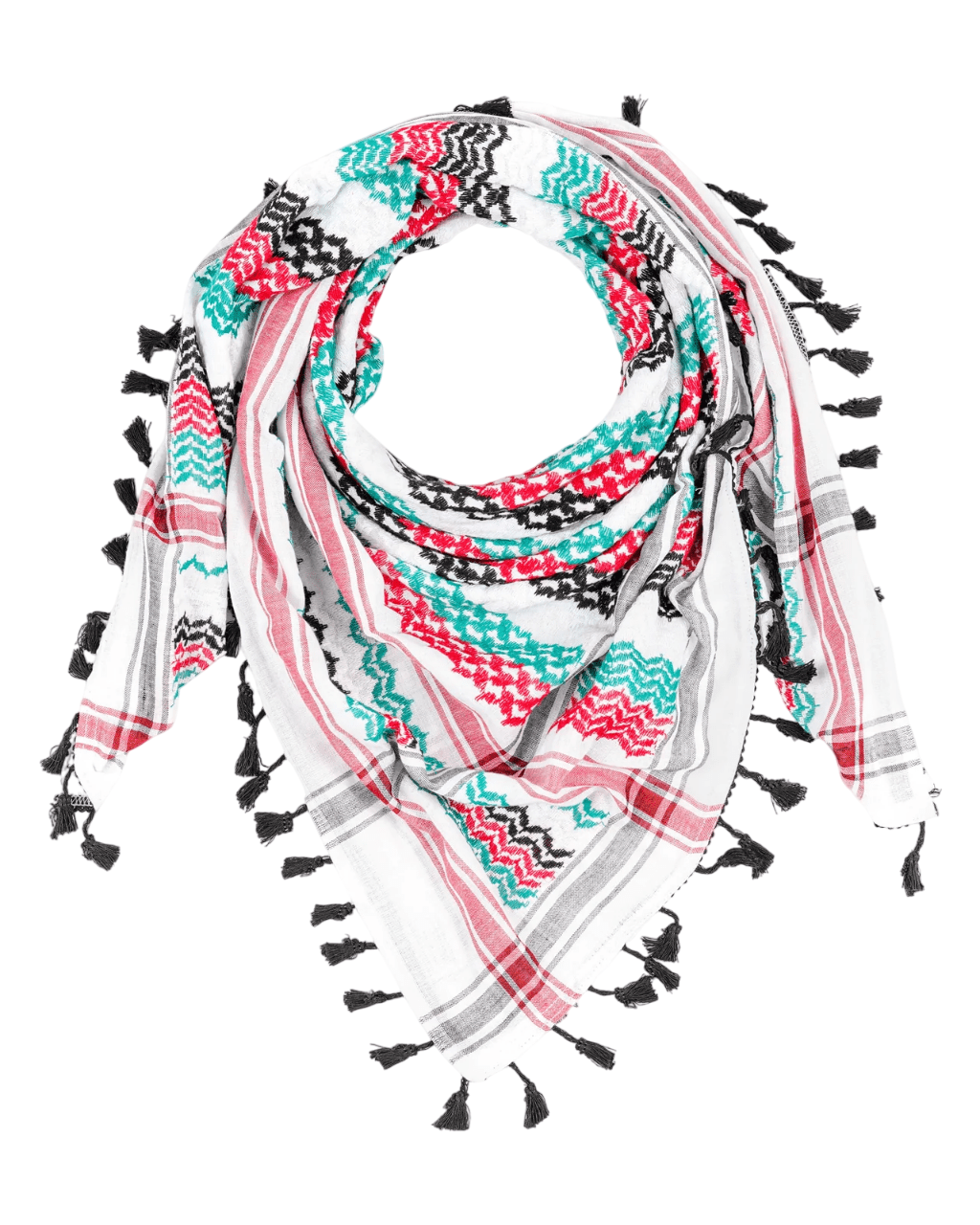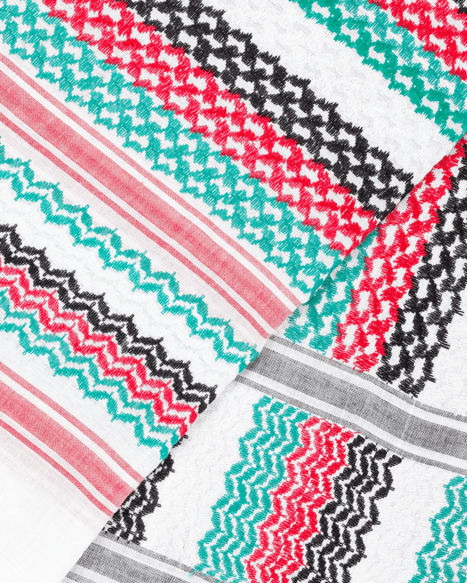 Brandish the vibrant Hurriya Kufiya®. A creative interpretation of the colours of the Palestinian national flag, Black, White, Red, and Green, symbolizing the ongoing struggle of all Palestinians to break free. To live in dignity, to move freely, and to raise our children without fear, and not be shackled from within an open-air prison. Hurriya is the struggle for our liberation.