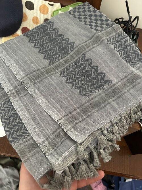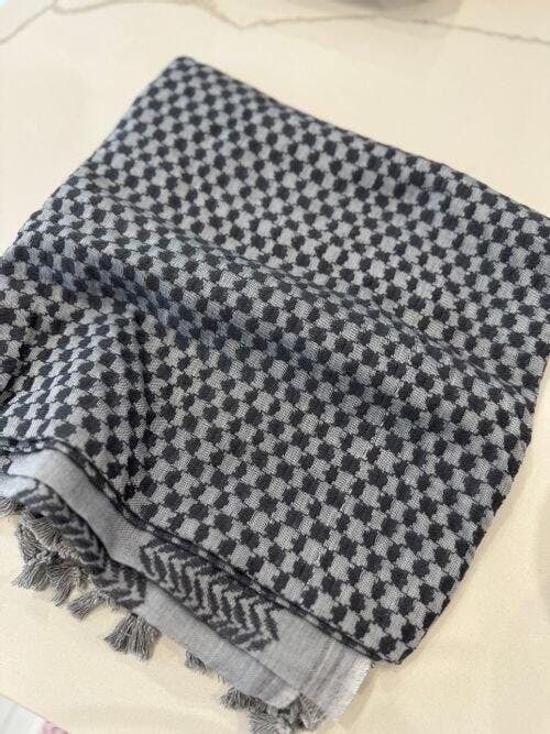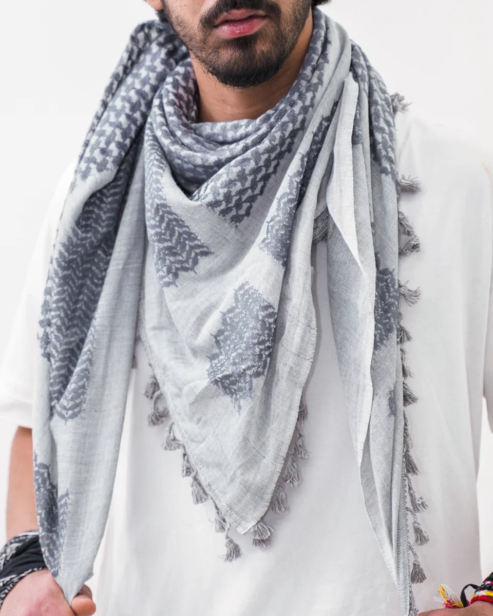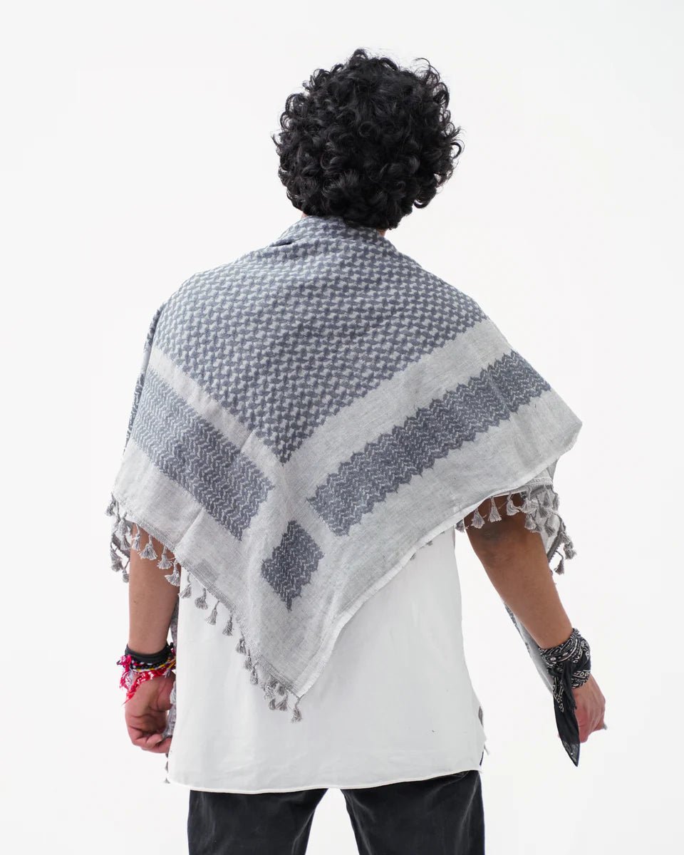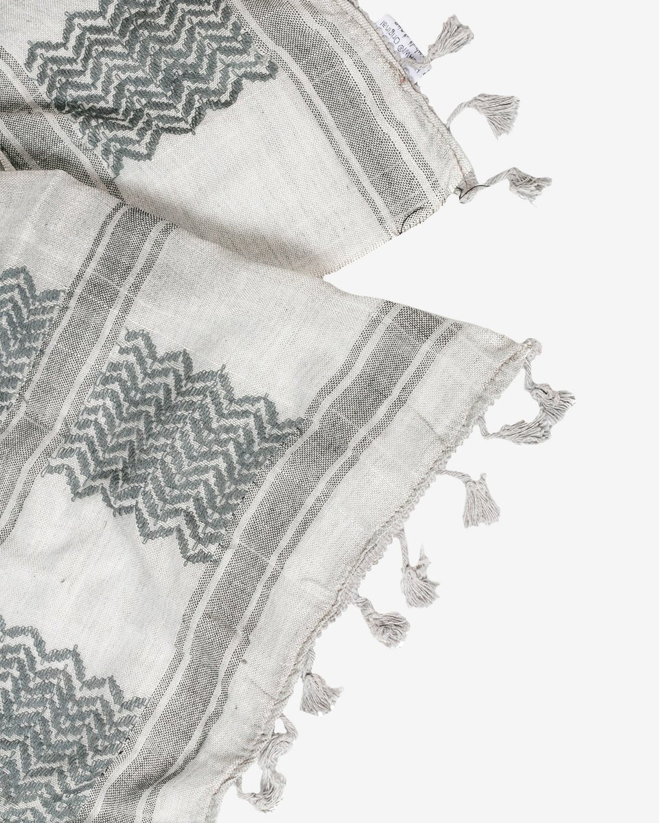 Our Nablus Kufiya, an authentic and traditional Palestinian shemagh, pays tribute to the remarkable people of Nablus. Renowned for their eloquence and warm hospitality, the city’s spirit is beautifully reflected in this elegant and witty keffiyeh. The dark gray pattern delicately woven on a light gray background captures the essence of Nablus, a city celebrated for its craftsmanship and traditional industries.