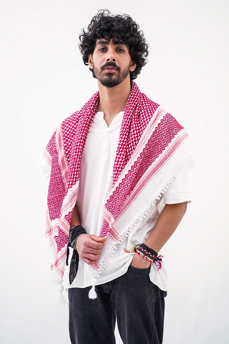 The traditional red and white Kufiya holds a rich history in Palestinian culture and has become a symbol of identity and resistance. Originally worn by Bedouins in the region, the Kufiya gained significance in the Palestinian context through its distinct colour combination.