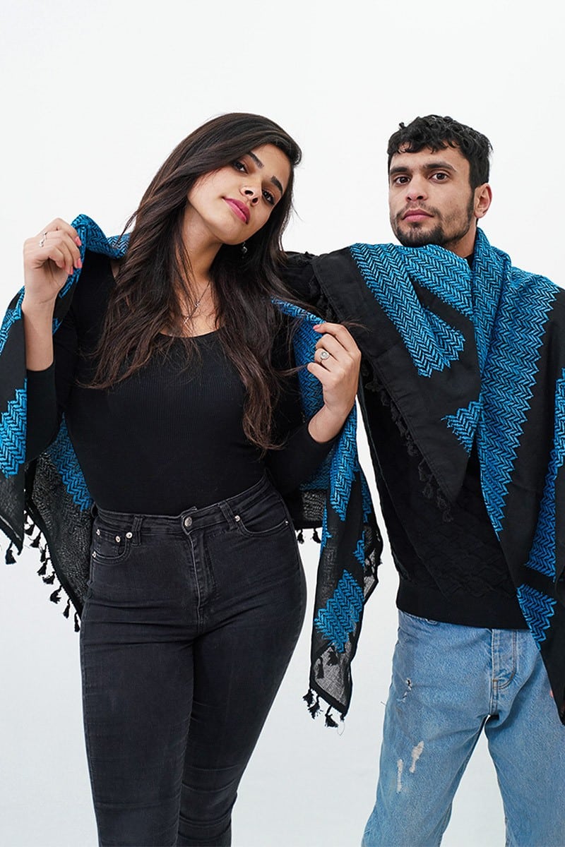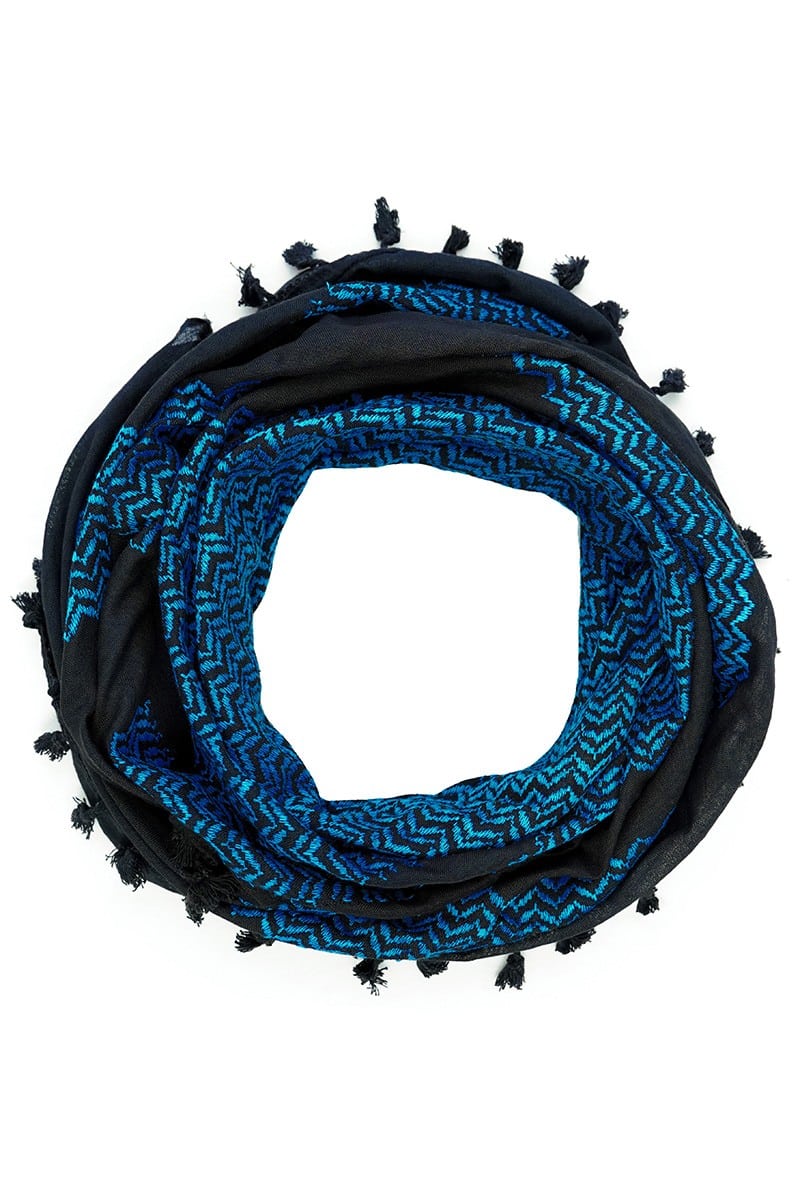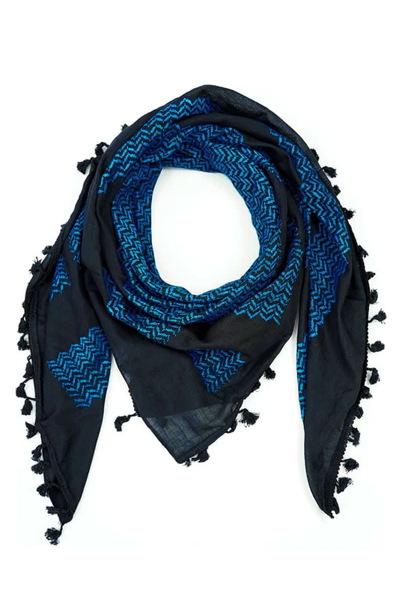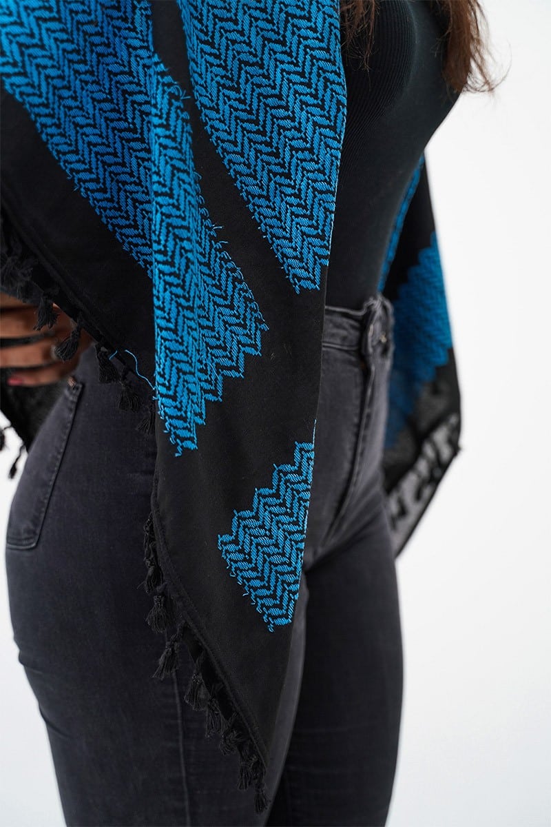 Our Yafa Kufiya is a striking tribute to the majestic city of Jaffa (Yafa), celebrated for its timeless beauty and rich history. The vibrant blue zigzag pattern against a deep black backdrop evokes the serenity of the city’s seaside and the sweeping views of the Mediterranean coastline. This authentic Palestinian Keffiyeh embodies the spirit of Yafa (يافا), meaning "beauty" in Canaanite, and honors the city’s legacy as the largest in historic Palestine before the 1948 Nakba. Jaffa holds a cherished place in the hearts of all Palestinians, and this Kufiya captures its essence.